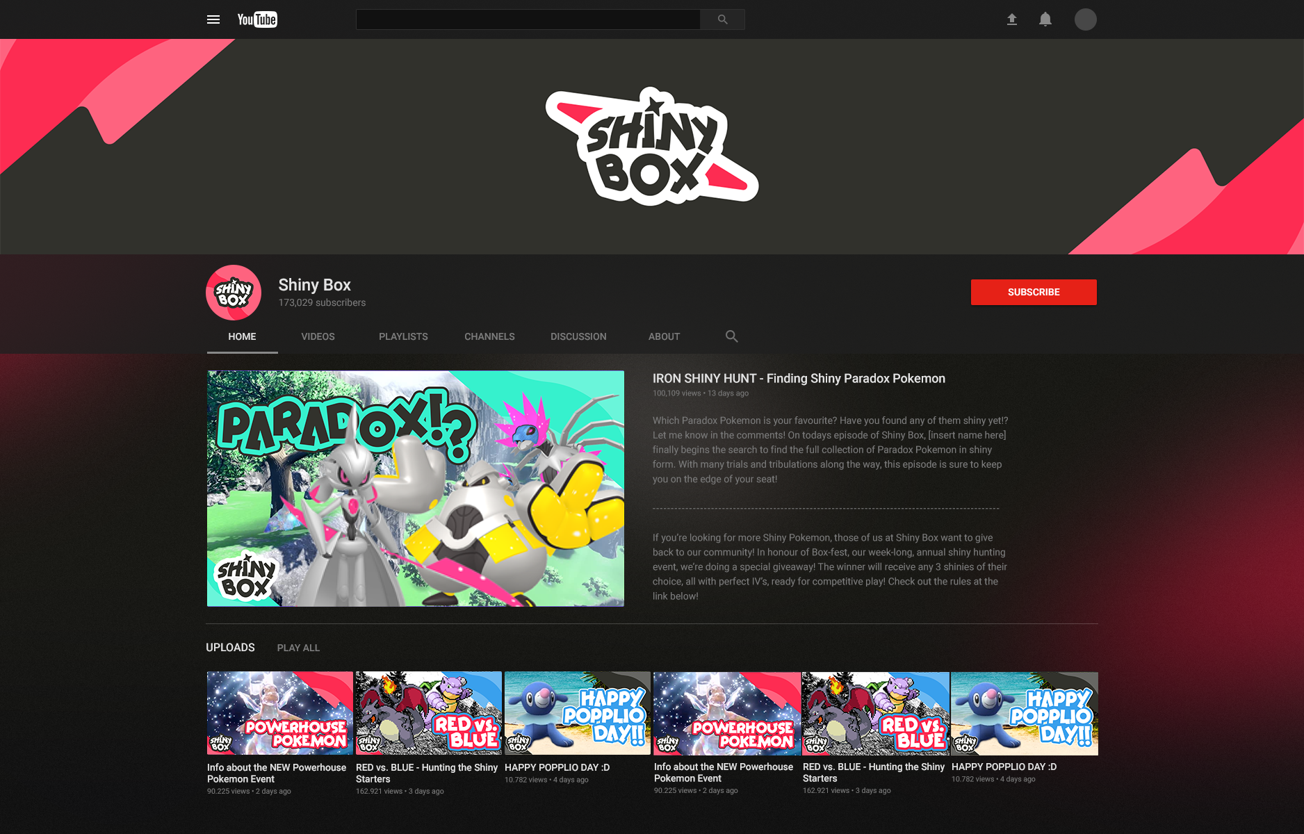 Shiny Box is YouTube's premiere Pokemon channel; filled with content of all kinds. It's the home for the highest quality shiny hunting footage and the most up-to-date news for all things Pokemon and related properties.